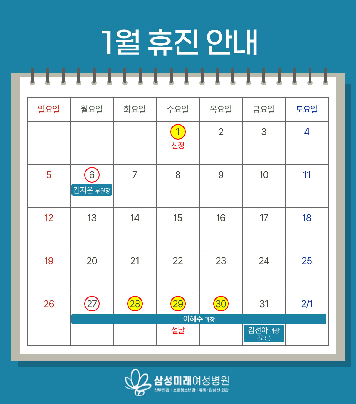 2025년 1월 의료진 휴진 안내 페이지 정보 작성자 삼성미래 댓글 0건 조회 2,854회 작성일 24-12-18 14:02 목록 본문 이전글2025년 가임력 검사 지원 안내 25.01.09 다음글성탄절 (12월25일), 신정 (1월1일) 진료안내 24.12.16 댓글 0 댓글목록 등록된 댓글이 없습니다.