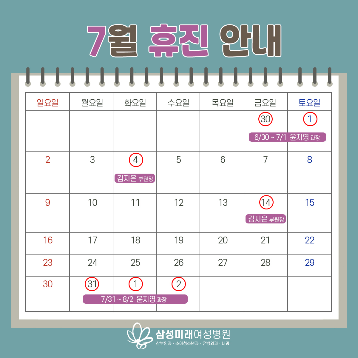 7월 의료진 휴진일정안내 페이지 정보 작성자 삼성미래 댓글 0건 조회 4,349회 작성일 23-06-28 16:25 목록 본문 안녕하세요 ?7월 의료진 휴진 일정 안내 드립니다 참고하셔서 진료에 불편 없으시길 바랍니다 이전글토요일 진료시간 변경안내 23.07.04 다음글6월 27일 랜선 출산 준비교실 안내 23.06.13 댓글 0 댓글목록 등록된 댓글이 없습니다.