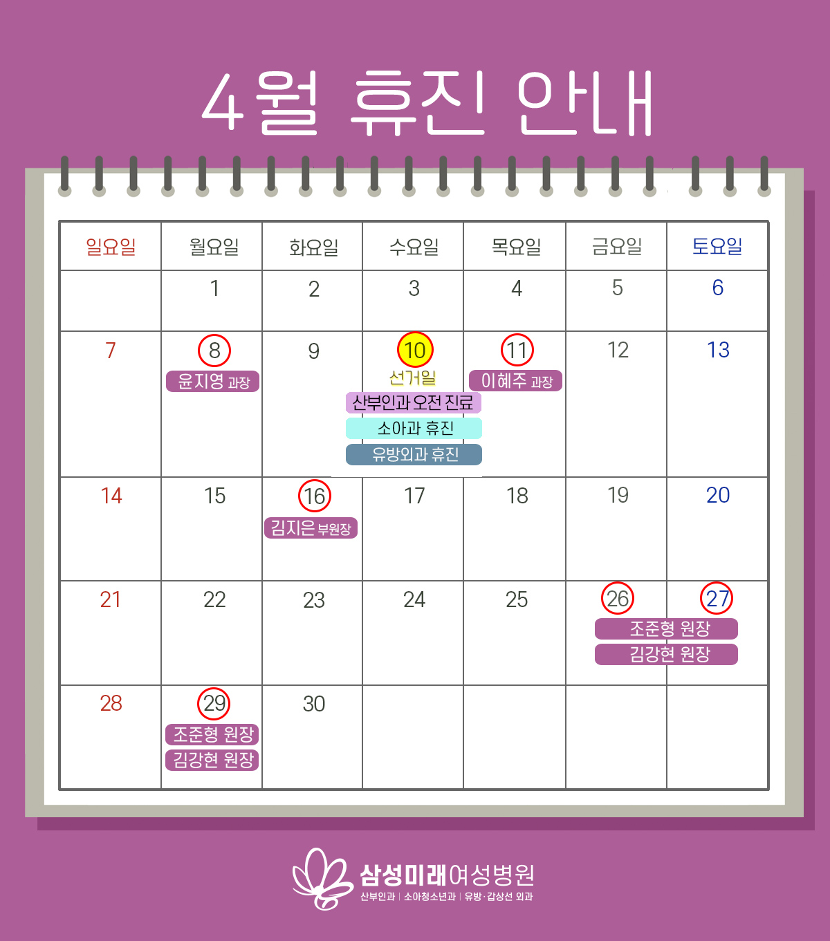 4월 의료진 휴진 일정안내 페이지 정보 작성자 삼성미래 댓글 0건 조회 3,903회 작성일 24-03-26 09:39 목록 본문 안녕하세요 ? 4월 의료진 휴진일정 안내 드립니다 참고하셔서 진료에 불편 없으시길 바랍니다 이전글4월 23일 출산 준비교실 강좌 안내 24.04.04 다음글4월 10일 (국회의원 선거일 ) 진료안내 24.03.25 댓글 0 댓글목록 등록된 댓글이 없습니다.